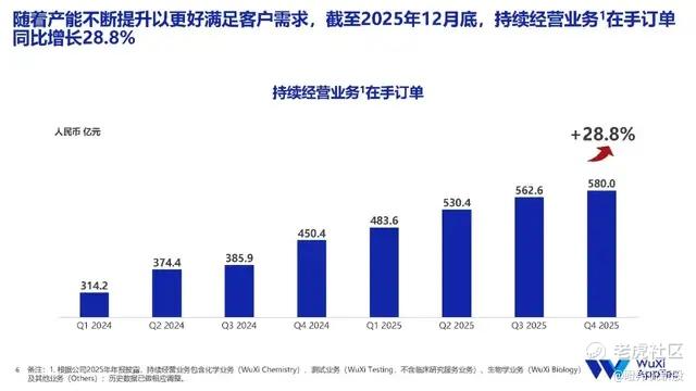 在BD时代,药明康德质量与速度兼具的价值凸显,赢得了Biotech和MNC的双重信任。数据是最好的证明,截至2025年12月底,药明康德持续经营业务在手订单高达580亿元,同比增长28.8%,已足以全覆盖2026年的业绩指引。