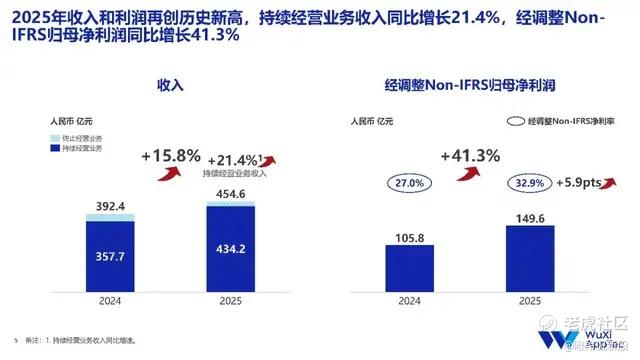 2025年的财报,给出了最硬核的验证。剔除资产处置收益,药明康德主业依旧保持了高质量的盈利,爆发力惊人:持续经营业务收入434.2亿元,同比增长21.4%;经调整Non-IFRS归母净利润149.6亿元,同比增长41.3%;均远超行业均值。