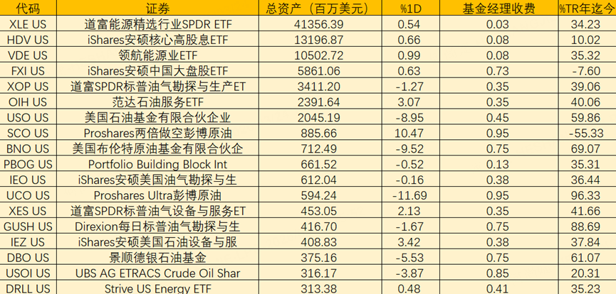 原油期货类ETF方面, $美国原油ETF(USO)$ 总资产约20亿美元,管理费0.45%,通过持有WTI原油期货跟踪油价,是最常用的原油价格工具之一; $美国布伦特原油基金有限合伙企业(BNO)$ 规模约7.1亿美元,管理费0.75%,跟踪布伦特原油期货,更贴近中东与欧洲市场,对地缘冲击更敏感。