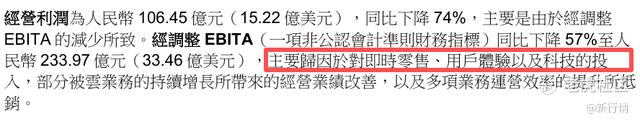 财报中,阿里巴巴坦言,盈利下跌的主要原因是对即时零售、用户体验以及科技的投入所致。
