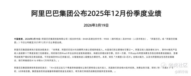 3月19日,阿里巴巴发布了2026财年第三财季财报。