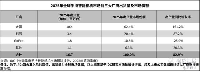 据IDC数据,2025年,大疆以1040万台出货量、62.4%的全球市场份额领跑手持智能相机市场,影石则以340万台出货量、20.4%的全球市场份额紧跟其后,排名第二。