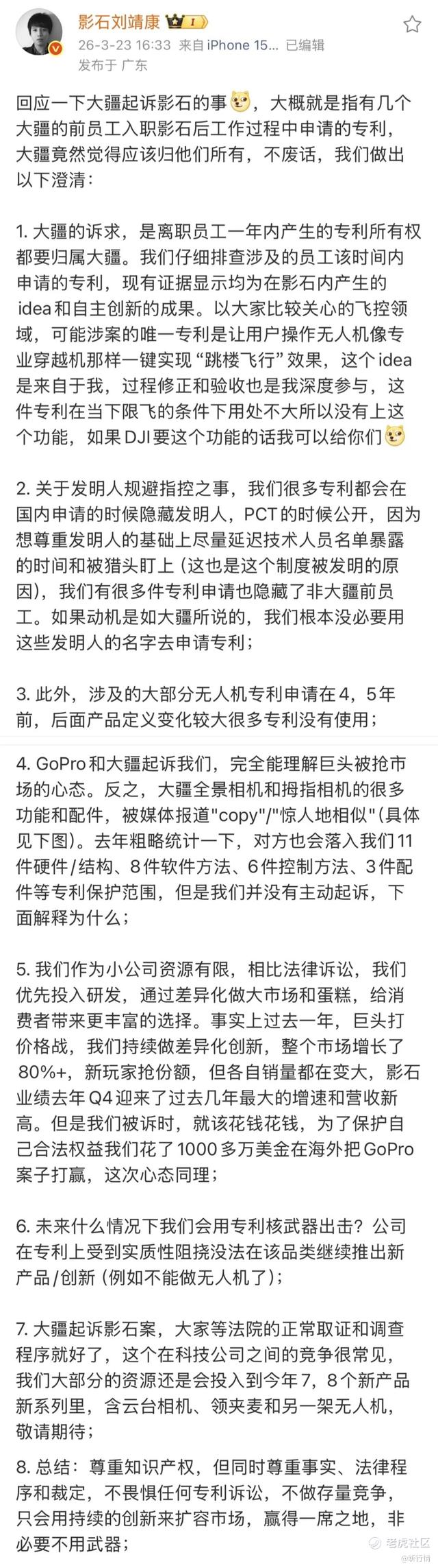 简单说,影石的态度是:不畏惧任何专利诉讼。