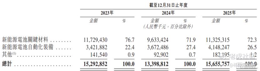具体来看,2023年至2025年(简称“报告期”),公司70%以上的收入来自新能源电池关键材料,新能源电池自动化装备的收入占比从22.4%提升至26.5%,还有小部分其他收入来自销售边角料。