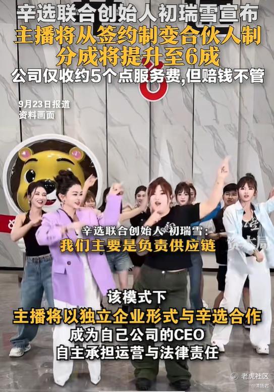 过去几年,辛选集团的高度繁荣建立在辛巴个人IP的绝对统治力之上。但这种模式的风险也显而易见。据2025年9月蓝鲸新闻报道,辛选集团已主动推进了一场静悄悄的管理革命:将传统的主播签约制改为事业合伙制。在这一新架构下,主播转变为自负盈亏的独立经营者,而辛选集团则退居幕后,转型为供应链、品控与仓储的服务商,仅收取5%服务费。