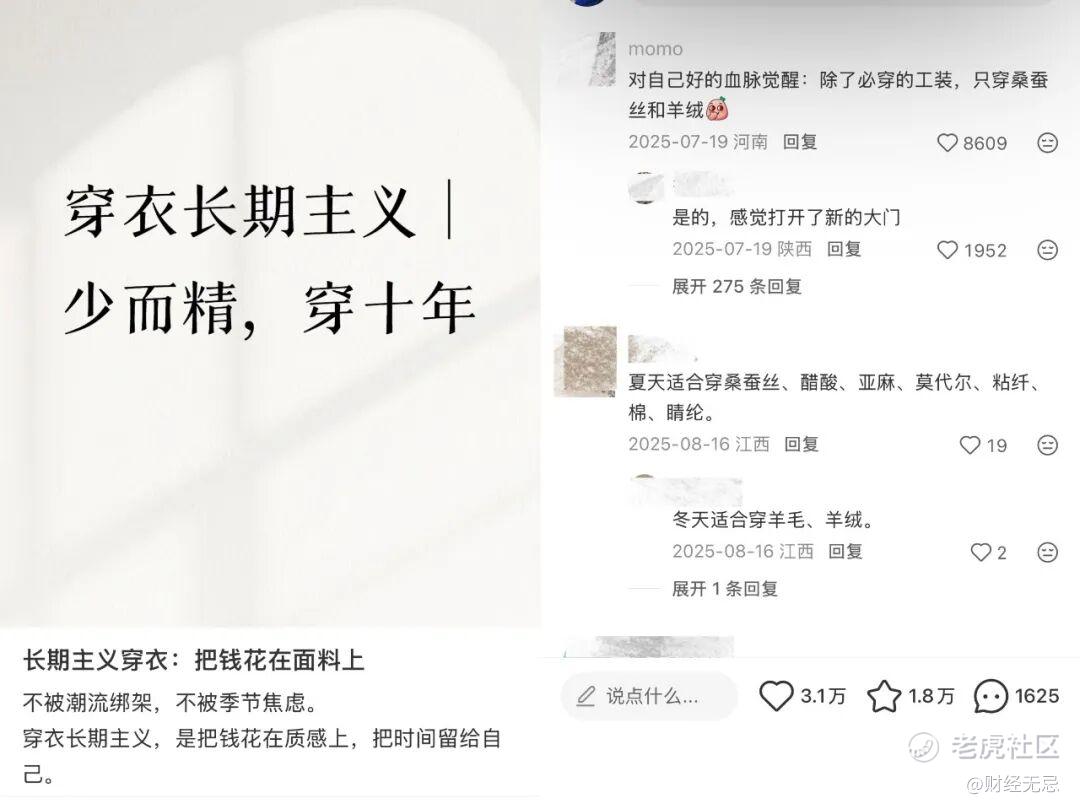 近年来服饰消费变迁印证了这一点,社交媒体上,最火热的话题不再是打折、显瘦穿搭,而是对面料、工艺、设计场景的追问,讨论可持续衣橱的构建、怎么穿更有质感。