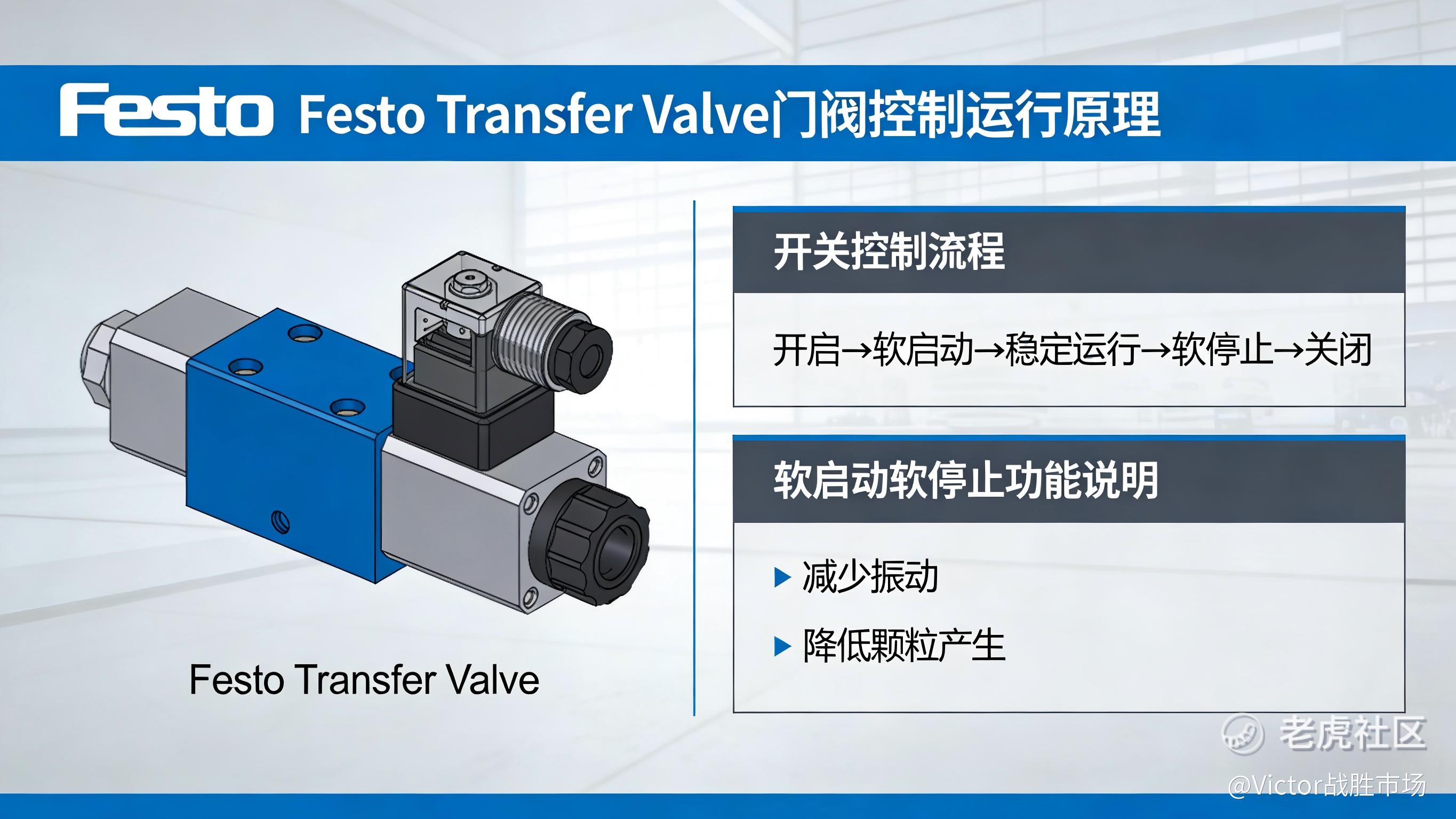 Festo基于高精度智能气动控制,提出了Transfer Valve门阀开关控制方案。它的核心思路是: 用比例压力控制技术,对阀门气缸运动进行连续调节,把刚性开关改成可编程、可调节的动态过程。