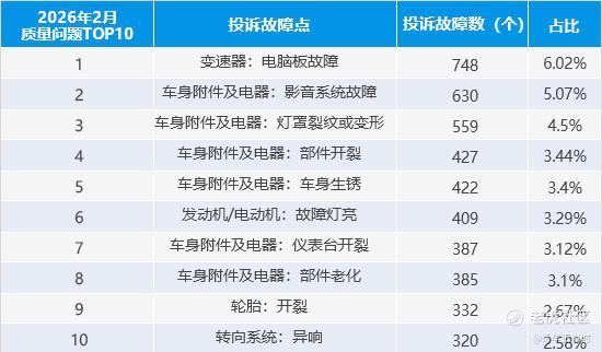 国内知名的汽车投诉网站“车质网”发布了2026年2月的车型投诉排行榜单!汽车的变速箱电脑板故障成为今年2月最突出的质量问题,从TOP10投诉故障点榜单中可以看到,“变速箱电脑板故障”排名一举跃升至首位,投诉故障数达到748个,占比达到6.02%。