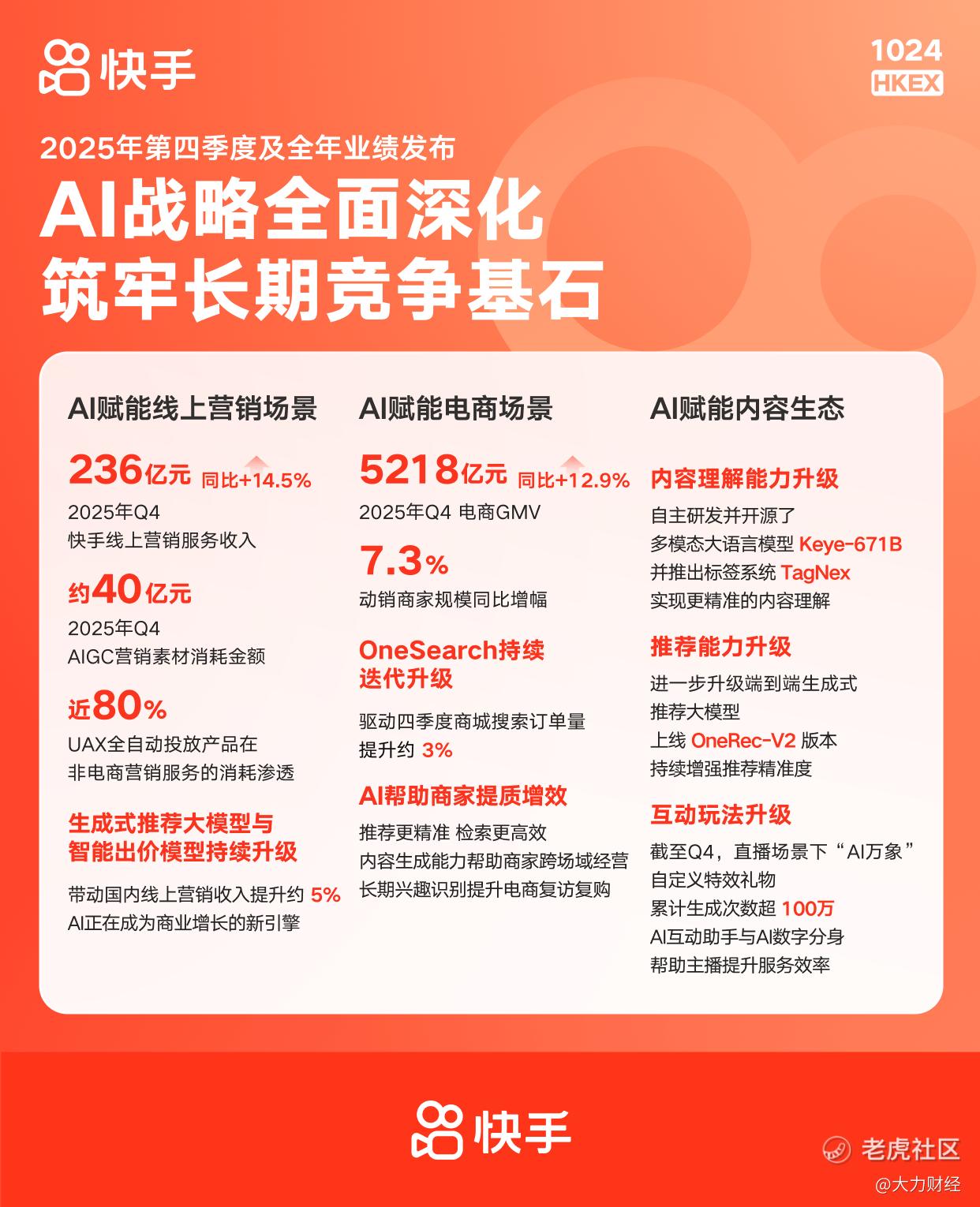 在电商业务方面,2025年第四季度,快手电商GMV同比增长12.9%至5218亿元。端到端生成式检索架构 OneSearch持续迭代升级,驱动商城搜索订单量提升约3%;推荐、检索、内容生成、长期兴趣理解与订单AI诊断等能力持续落地,帮助商家提升跨场域经营能力、优化转化效率和经营质量。