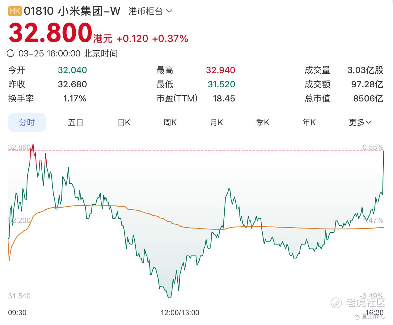 此次亮眼年报的发布,也没能大幅扭转颓势。今日,小米微跌开盘,盘中短暂回升后,开始震荡下行。截至收盘,小米微涨0.37%报32.8港元,总市值8506亿港元。