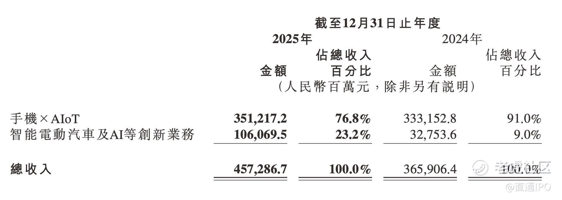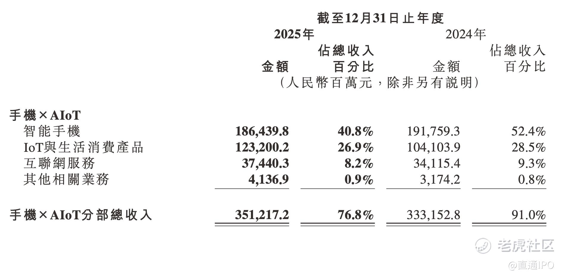 小米解释称,主要是由于智能手机出货量减少及ASP下降所致。由于印度出货量减少,小米智能手机的出货量由2024年的1.685亿部减少2.0%至2025年的1.652亿部,减少约330万部,国内下滑18.2%,海外下滑8.8%。智能手机的ASP由2024年的每部1138.2元,下降0.8%至2025年的每部1128.7元。