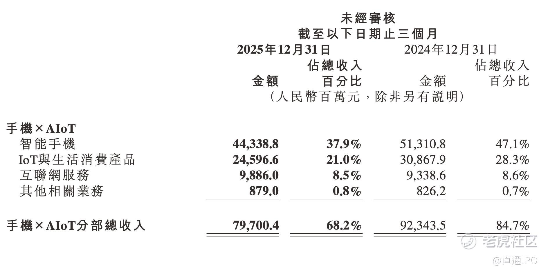 再来看2025年Q4,小米手机×AIoT分部收入由2024年Q4的923亿元减少13.7%至797亿元,环比2025年Q3的841亿元减少5.2%。