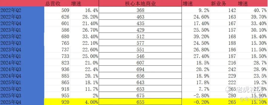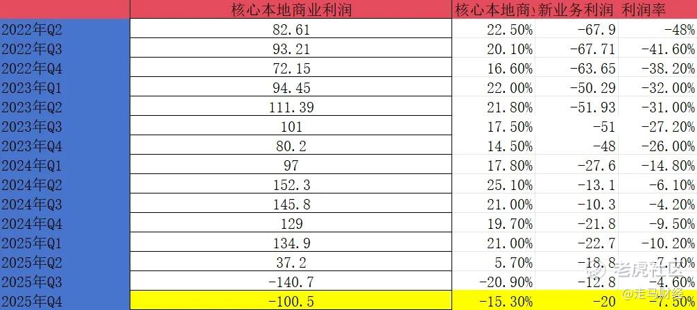 同时,公司也披露,2025年度核心本地商业经营亏损在68-70亿区间,取中间值69亿,已知2025年前三季度核心本地商业经营利润分别是134.9亿、37.2亿、-140.7亿,可以推算出来2025年Q4经营利润为约-100.5亿。