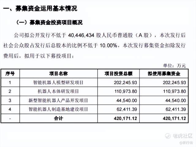 招股书显示,本次A股IPO,宇树科技拟公开发行新股不低于4044.64万股,募集资金约42.02亿元,计划用于智能机器人模型研发、机器人本体研发、新型智能机器人产品开发及智能机器人制造基地建设四大项目。