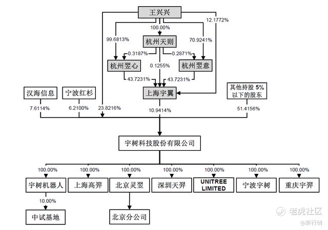 一方面,宇树科技采用的是“同股不同权”的架构,王兴兴持有的A类股份每份享有10票表决权。