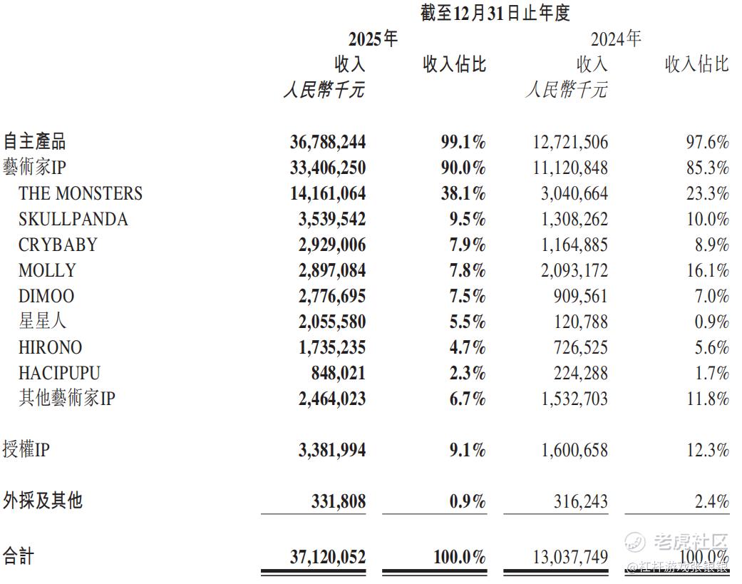 其中THE MONSTERS(LABUBU)封神: 这个诞生十年的IP,在2025年贡献了141.6亿元的营收,同比增长365.7%,占总营收的38.1%。