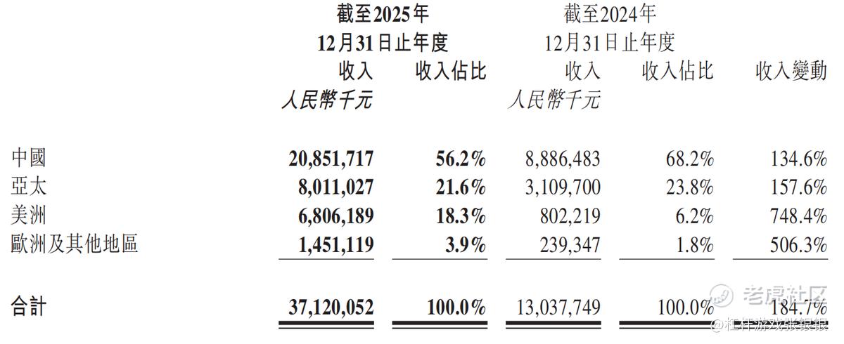 反而中国市场还有点拖后腿:2025年收入208.52 亿元,同比增长134.6%,占比从68.2% 降至56.2%,仍是基本盘但增速低于整体。