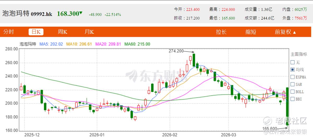 2026年3月25日,泡泡玛特披露2025年业绩报告,数据炸裂。但与此同时该司港股价格跳崖式下跌,当日跌幅达22.51%,市值缩水超过650亿港元,相当于跌掉1.6个名创优品。