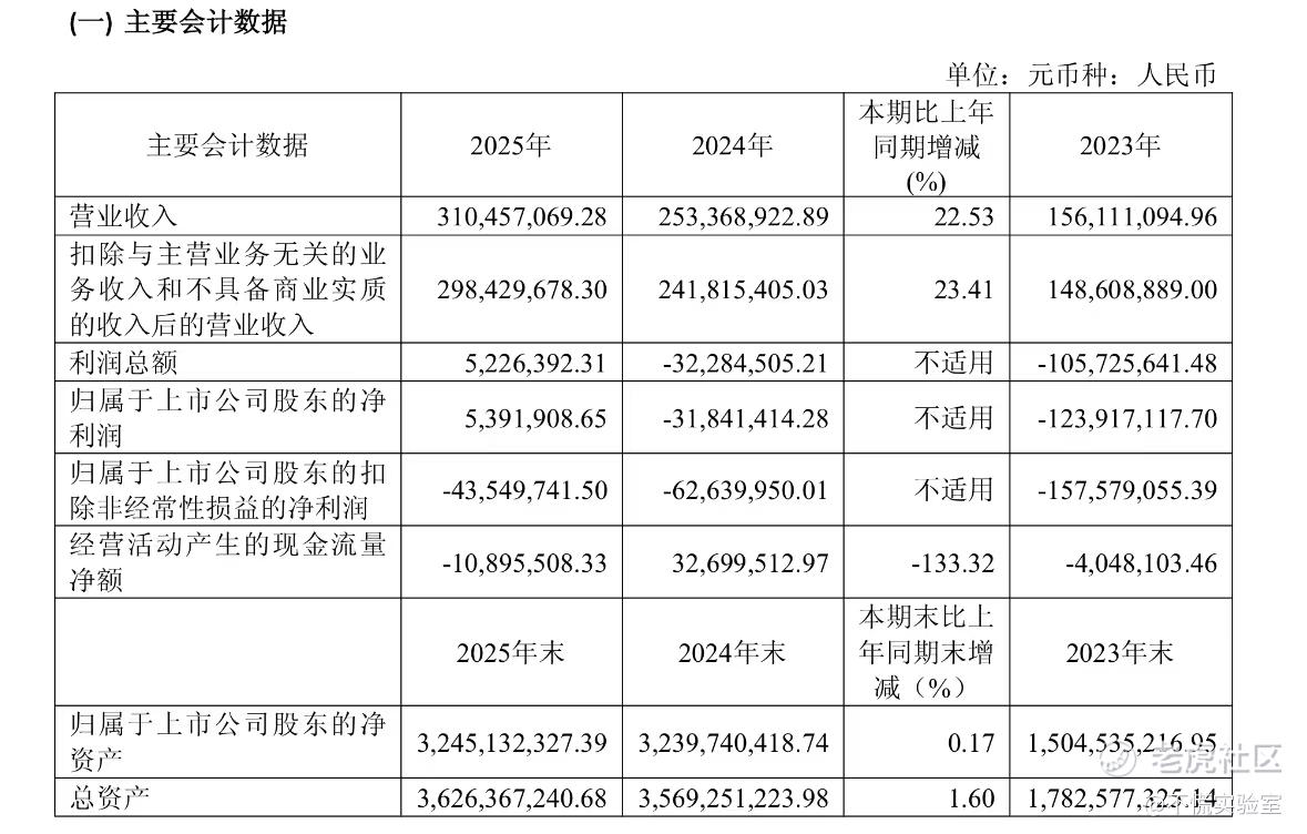 2025年,公司全年实现营业总收入3.10亿元,同比增长22.53%;归属于母公司所有者的净利润539.19万元,较上年同期3184.14万元的净亏损成功扭亏为盈,基本每股收益从-0.40元转正至0.05元。