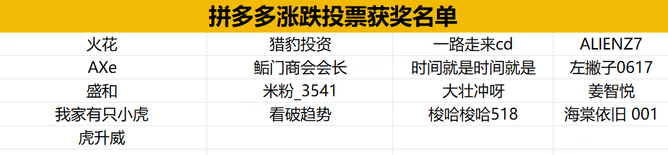 昨晚 $拼多多(PDD)$ 涨4.61%,恭喜以下17位虎友押注成功,一起瓜分300虎币,每人获得18枚虎币,恭喜大家!