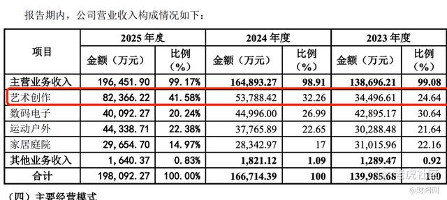 报告期内,千岸科技营收结构出现大幅异动,波动幅度远超行业正常水平,进一步加剧了业绩真实性质疑。2022-2024年,公司家居庭院类产品收入占比从30.88%骤降至17.00%,降幅超45%;而艺术创作类产品收入占比从19.02%飙升至32.26%,增幅超69%,两大核心品类占比一降一升,波动幅度远超同行。