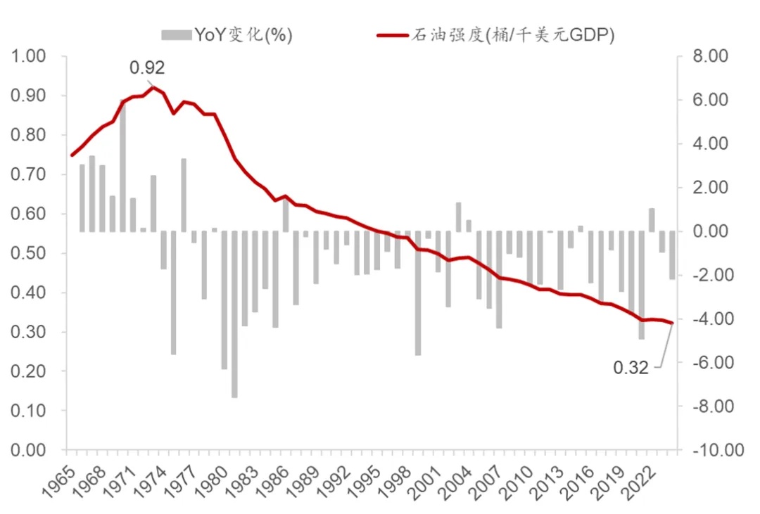 第二,能源结构已经发生变化,新能源替代效应持续显现。衡量经济体对石油依赖程度的核心指标是“石油强度”,即每单位GDP所消耗的石油量。1970年代初这一数值约为0.92桶/千美元GDP,当前已降至0.32。在经济产出相同的条件下,当前所需消耗的石油量仅为五十年前的约三分之一,油价上涨对整体生产成本的渗透程度已大幅收窄。