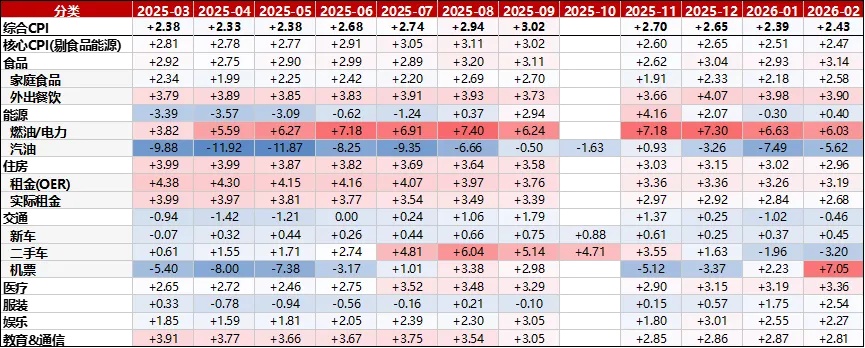 其次当前美国CPI的主要压力来源是住房和服务类分项:住房年同比虽从2022年7.47%的峰值回落,但2026年2月仍维持在2.96%;外出餐饮年同比接近4%;医疗年同比约3.36%。这些分项的价格动态与油价走势高度并不敏感,由劳动力成本、租金周期等内生因素驱动。油价的涨跌,对它们的相对变化几乎不构成直接扰动。