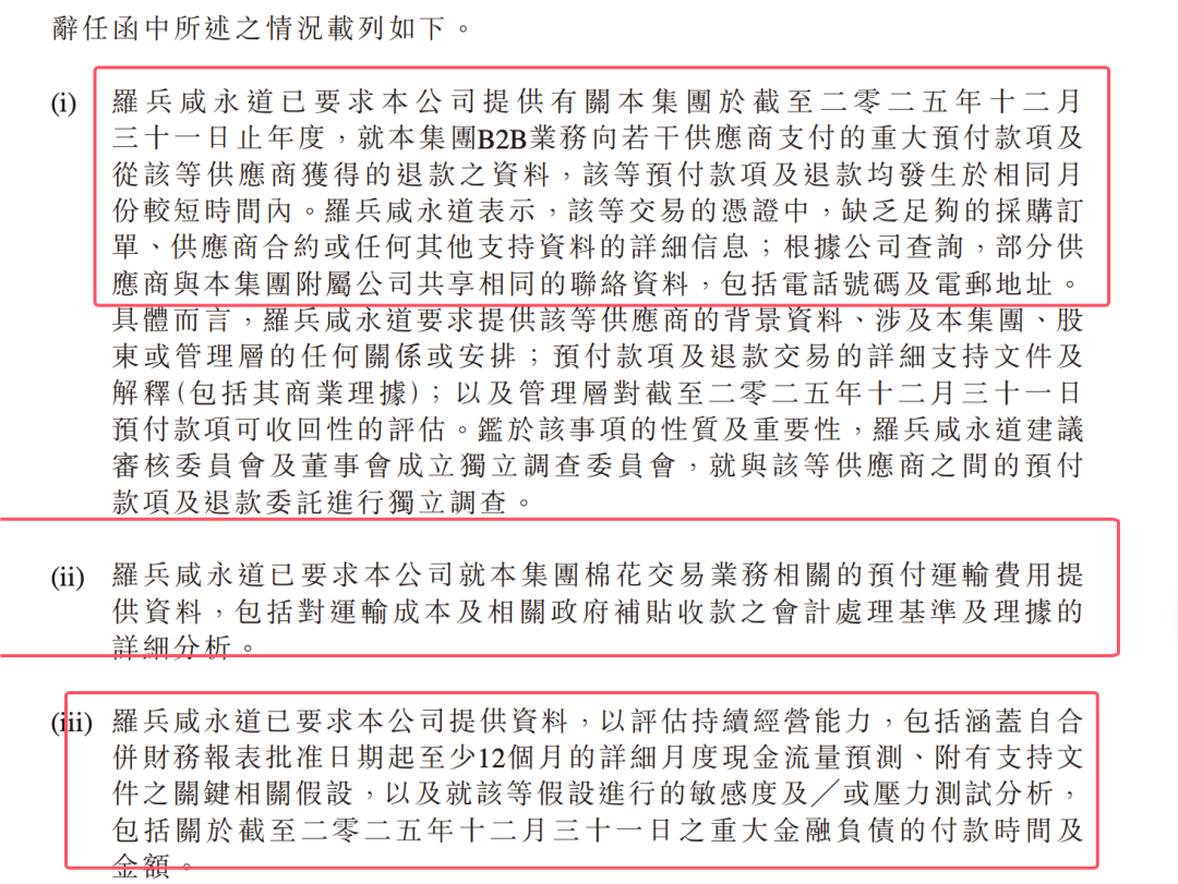 公司应对措施:已成立委员会核查 B2B 预付款事项,评估相关会计处理并与贷款方磋商,称更换核数师是为尽快以合理成本完成 2025 年度审计。