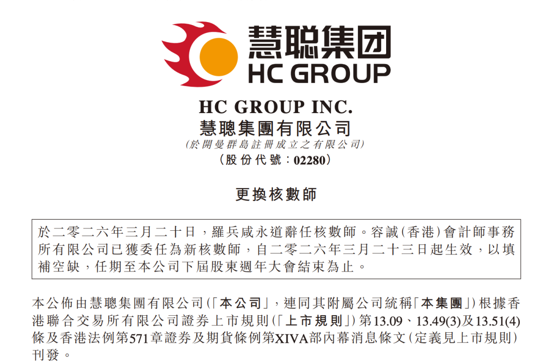 核数师变更:2026 年 3 月 20 日罗兵咸永道辞任慧聪集团核数师,3 月 23 日起容诚(香港)获委任为新核数师,任期至下届股东周年大会结束。
