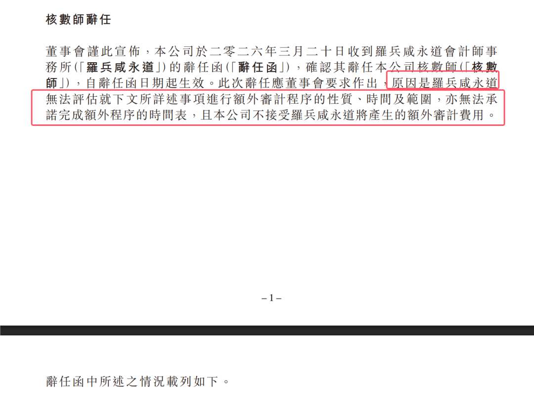 辞任核心原因:应公司要求辞任,双方未就额外审计程序、时间安排及额外审计费用达成一致;罗兵咸永道因未获得充分资料,无法完成三项关键审计核查: