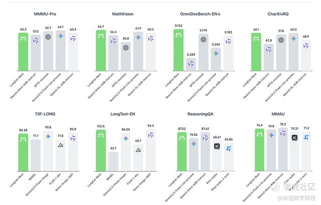 LongCat-Next 在视觉理解、图像生成、音频、智能体等多个维度的基准测试中,以一套离散原生框架,展现出与多模态专用模型相当甚至领先的性能,验证了三个关键发现。