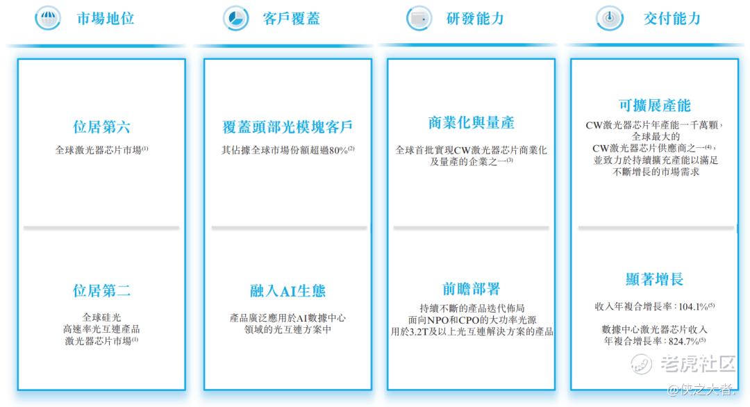 根据招股书,以2025年的对外销售收入计,公司是全球第六大激光器芯片供应商以及全球第二大硅光高速率光互连产品激光器芯片供应商。公司还是全球少数能够以千万颗单位规模量产CW激光器芯片的公司之一,这凸显了公司在全球供应链中的独特地位及可靠性。