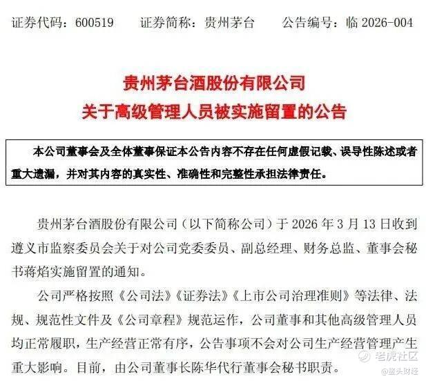 3月13日晚间,贵州茅台(600519.SH)发布公告显示,公司于当日收到遵义市监察委员会关于对公司党委委员、副总经理、财务总监、董事会秘书蒋焰实施留置的通知。