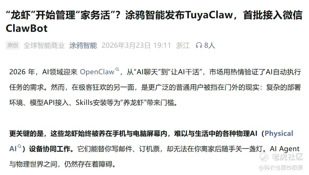 $涂鸦智能(TUYA)$ 公众号天天发各种黑科技,CES展、法兰克福展的AI方案一个接一个,AI宠物的产品方案也在不断落地,TuyaOpen框架能调全球顶尖大模型,DuckyClaw端侧AI还解决了隐私和延迟,连家庭能源管理都能做到电费降54%,全球180万开发者摆在那,财报净利润率也一路涨,硬实力是真没话说。