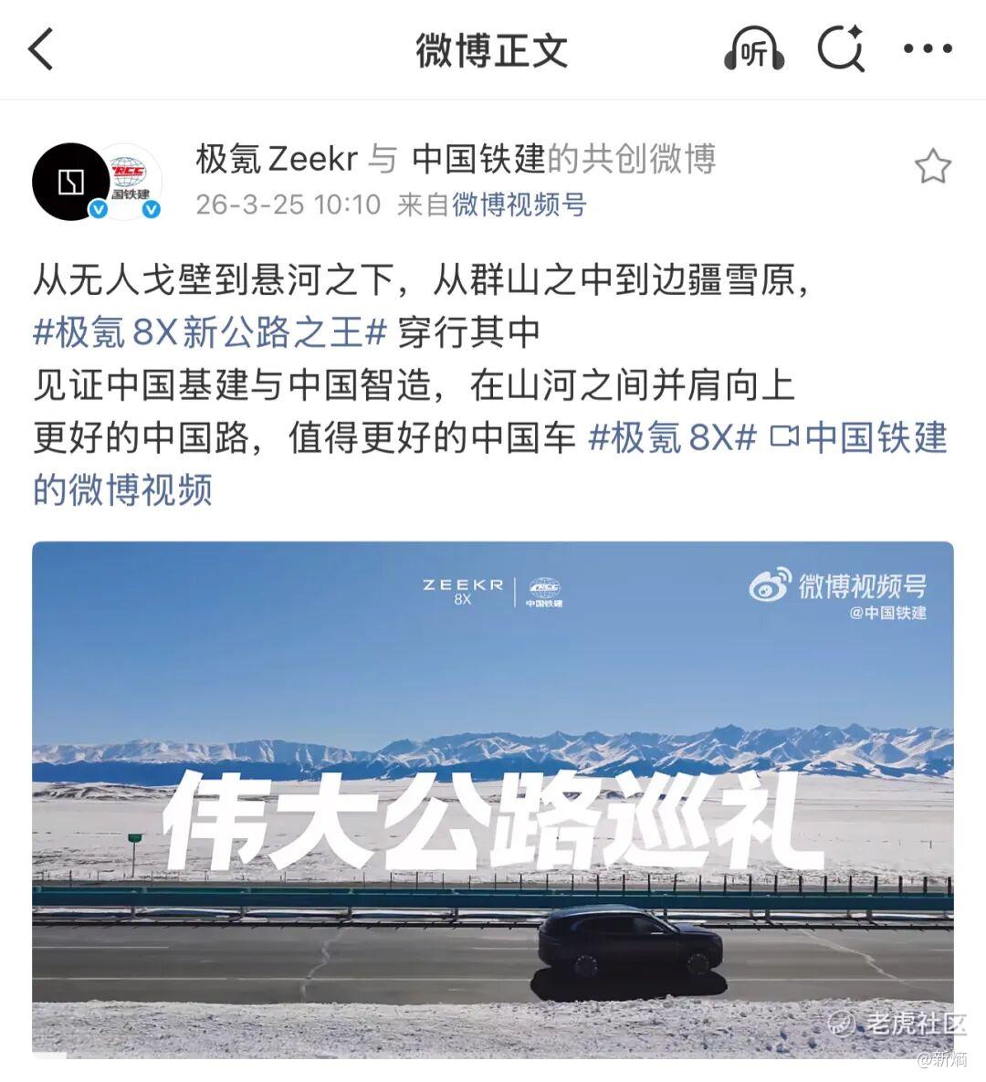 但这并非一场汽车圈的独角狂欢。3月25日,极氪8X携手中国铁建,共同呈现《伟大公路巡礼》主题大片,“更好的中国路,值得更好的中国车”获得了众多网友的点赞和认同。