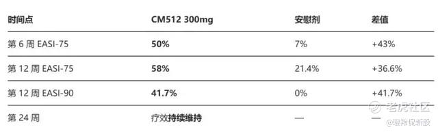 CM512在早期1b期中重度临床初步兑现了其差异化设计潜力,治疗组仅给药3次,在第6周EASI-75便达到了50%(安慰剂组为7%),第12周EASI-75、EASI-90分别为58%、41.7%,对应安慰剂组分别为21.4%和0%。可以看到,CM512起效速度较好,EASI-90这种深度清除指标强,在24周再无补充给药背景下疗效持续维持(一个月内给药三次),并且安全性与安慰剂组相似。