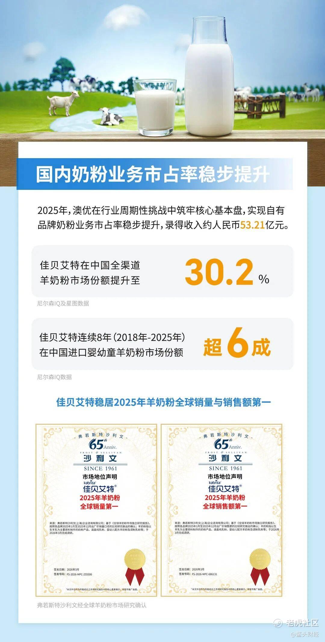 尼尔森IQ数据同时显示,公司牛奶粉业务稳住市场份额,标志着因前期内部整合与渠道调整带来的阶段性影响全面结束。截至公告发布期,澳优旗下海普诺凯斩获艾媒咨询(iiMedia Research)“2025婴幼儿全面营养奶粉全国销量第一”及“中国全面营养婴配奶粉开创者”双重认证,这也是其连续三年蝉联全面营养奶粉销量榜首。