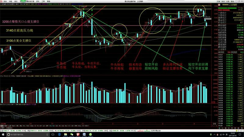 总体走势:#上证指数#小幅低开于60日线下,收盘跌破3200点整数关口心理支撑位,K线、均线及其他辅助指标亦呈现弱势下行之态。种种迹象均显示近期股指技术形态之弱。若仍继续下行,多方已无战略纵深,仅余120日线这条最后的防线。垂死挣扎,还是绝地反击,本周后几个交易日的走势将极为关键。A股市场,作为特殊的单边市,大多只能做多盈利。若后市股指有效跌破120日线,或许就可以清仓,提前准备度假去了。