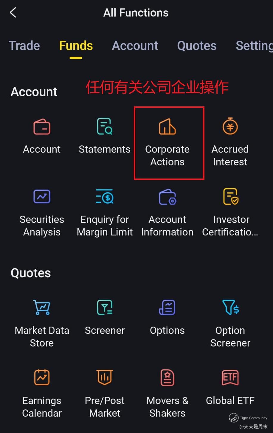 去到老虎APP - PORTFOLIO - MORE - CORPORATE ACTION