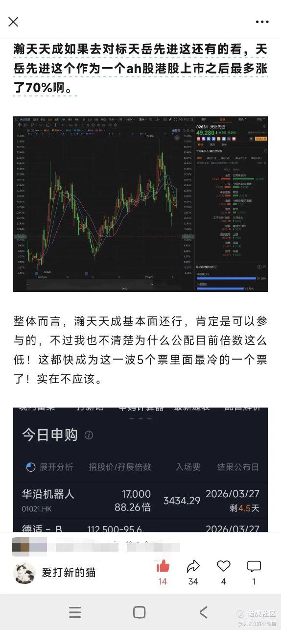 最冷的除了同仁堂之外就剩这个翰天天成了,这个票乙头要中17万的货!这个票的乙组确实能拿不少的货了。翰天天成H股他要入通的话,至少15%以上才是安全空间,如果说公司不想入通,那就什么都不顾往下自由落体。应该不至于作贱自己吧?翰天主线逻辑还是港股通,300亿的公司,没必要作践自己,搞得连入通都入不了。按理说冲一个港股通问题不大,总市值:324.55亿港元,H股市值:90.69亿港元,这个是相当于流通市值,现在港股通的安全最低门槛是104亿,104-90.69=13.31,13.31/90.69=0.146764!也就是说他要入通的话,至少15%以上才是安全空间,好的话往上冲一下20%多的涨幅应该有吧,实话说这个确定性非常大了,毕竟是一个市值300亿的大票,所以我是没想通为什么这么冷还没人打。都去赌什么18c的机器人搞这么热,这种确定性的肉不香吗?这样也好吧,分流一下省得所有人都过来抢。你要说这5个票的基本面,真是一言难尽了,硬说说基本面其实没一个好的,相比于这5个票里面,瀚天天成基本面是相对还行的,不过也是属于矮子里面找高个,这个票肯定是可以参与的,不过我也不清楚为什么公配目前倍数这么低!这都快成为这一波5个票里面最冷的一个票了!实在不应该。