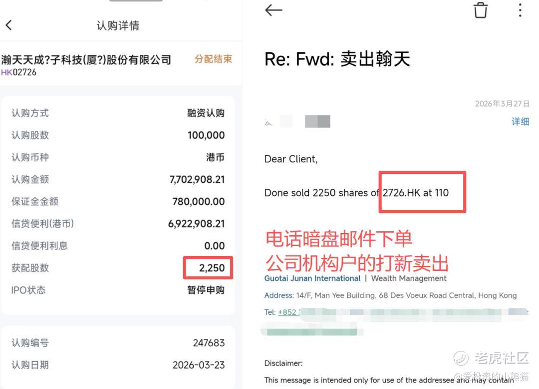 以 110 港元/股 卖出瀚天天成(02726.HK)乙头(2,250股),可盈利 75,915 港元,这次连国君公司机构户的电话暗盘我们都用了。