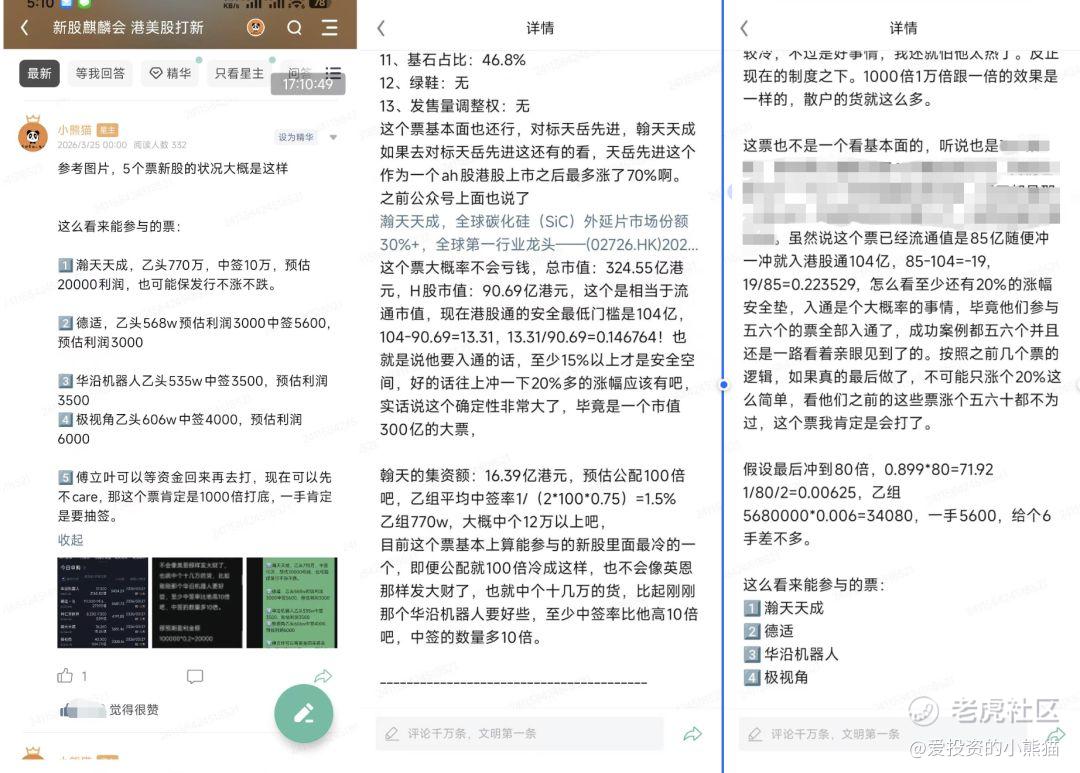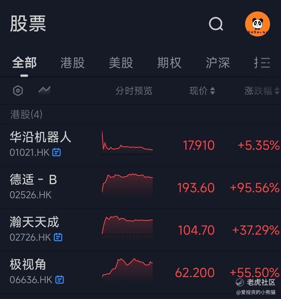 今天这暗盘的4个新股,表现是非常好了。基本上按照我们设想好的剧本, $瀚天天成(02726)$赚的最多,最火热的华研机器人赚的最少。不过也超出我们预期了,没想到瀚天能赚这么多,而华沿机器人能赚这么少。瀚天原本预估有个20%的涨幅就很不错了,优势在于货多,量大管饱,不过也没想到中签数量能有这么多,估计外面除了我们之外也没人敢打,乙组能中签17万的货真的是感谢外面人不跟我们抢货,感谢市场多数人对他的一致差评!要不然也不能再续映恩之传奇!那有时候市场意见过度一致,反倒是没什么肉了, $华沿机器人(01021)$ 原本还觉得这么火热能翻倍呢,没想到最后就被国配砸的只剩5个点,国配筹码远没有翰天和德适锁的牢。