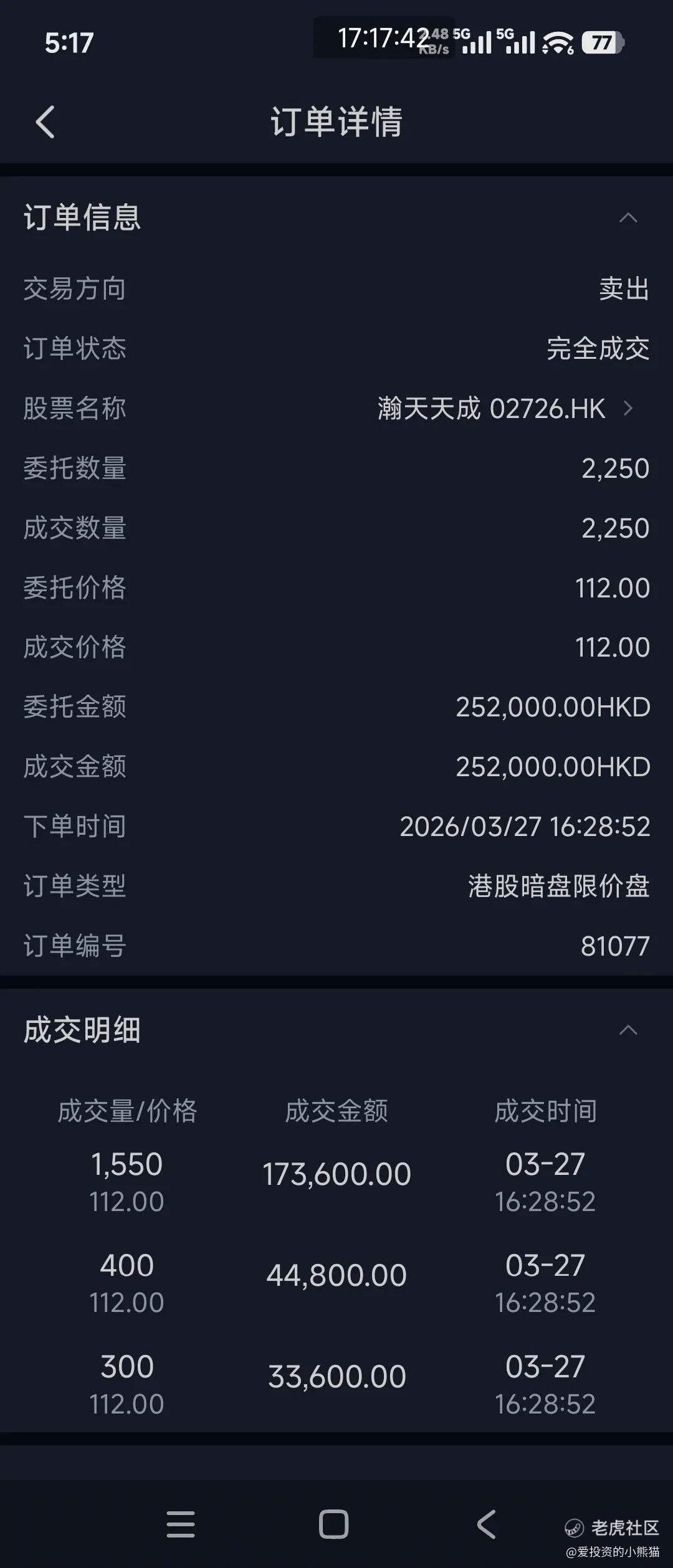 本次瀚天天成单是一个77万的乙头暗盘卖出盈利 80,415 港元。从中签金额17.1w变成卖出成交的25.2w