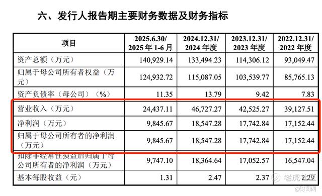 2022-2024年,公司营业收入从3.91亿元增至4.67亿元,年复合增长率仅8.4%;归母净利润从1.72亿元增至1.85亿元,年复合增速更低至5.7%。2025年未经审计数据显示,营收约5.12亿元,同比增长9.49%;净利润约1.99亿元,同比增长7.25%,仍未突破两位数增长。