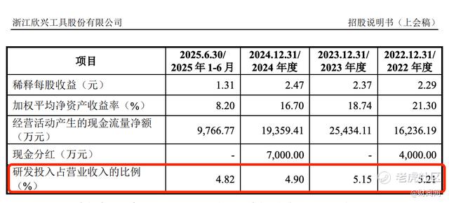 值得一提的是,作为拟登陆创业板的企业,欣兴工具的研发创新能力,同样备受质疑。招股书显示,2022-2024年,公司研发投入占营业收入的比例分别为5.21%、5.03%、4.82%,呈逐年下降趋势,且始终低于同行业头部企业6%-8%的平均水平。