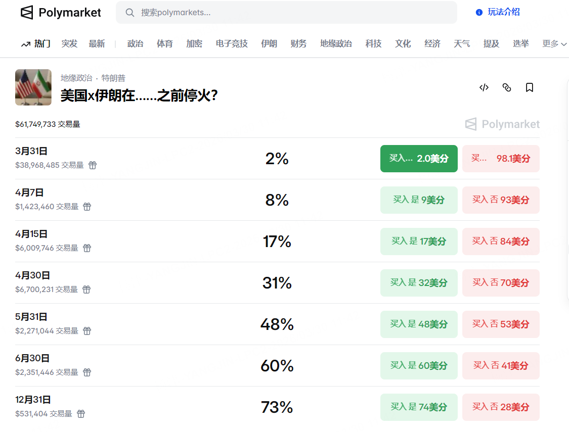现Polymarket上已有超6000万美元的“停战时间”押注,绝大多数押的都是下半年。不过本周还是有好消息的,这周最多就跌4天~[你懂的]