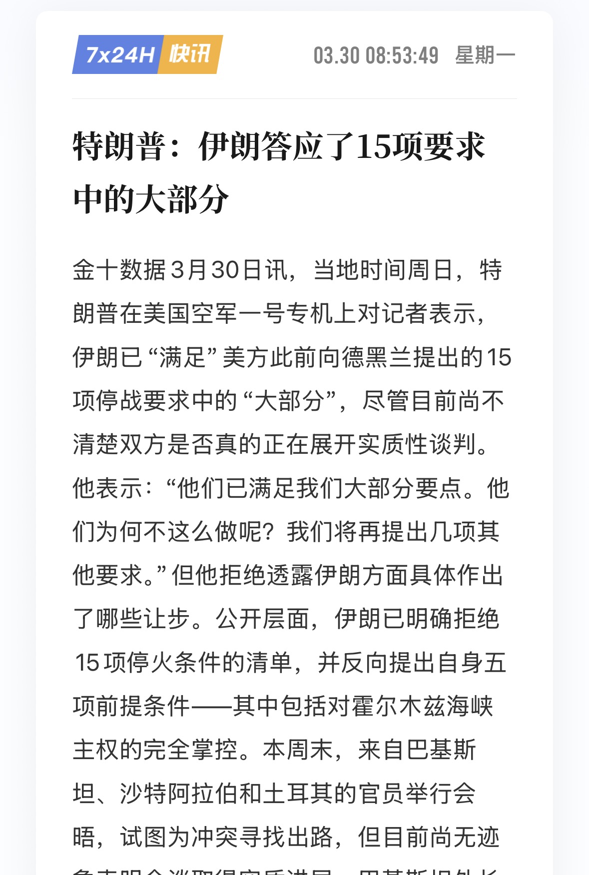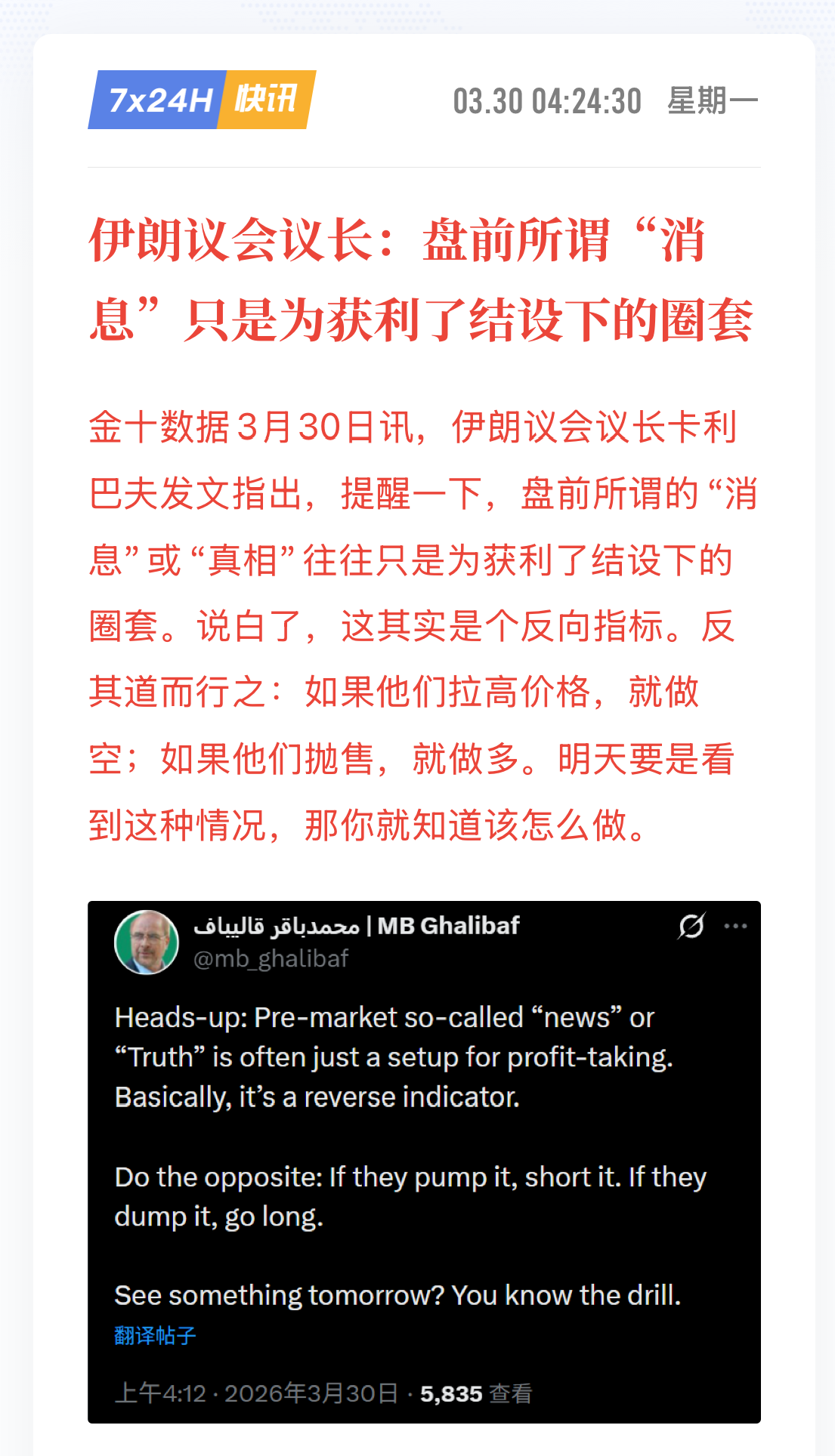 伊朗在拒绝“15点停火协议”时,还顺带“暗讽”了一下特朗普的股市TACO策略——伊朗议长称特朗普所有盘前的“fake news”都只是为了操纵市场、拉高出货,如果他们拉高价格,你就做空,反之如果抛售,你就做多。[笑哭]