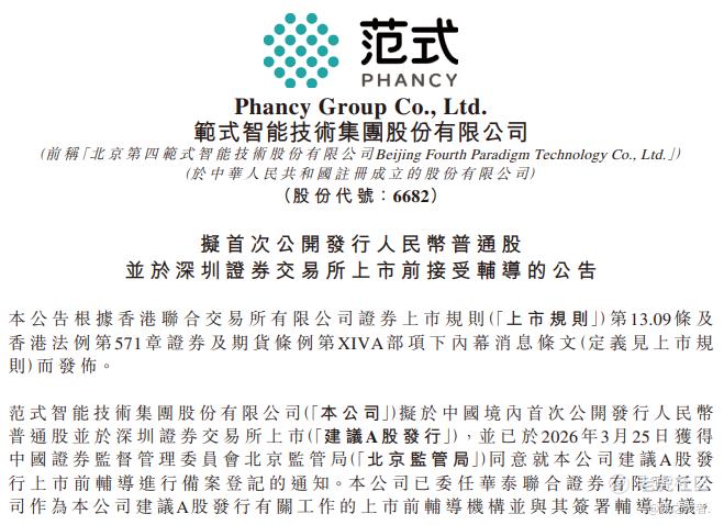 2026年3月26日,范式智能(6682.HK)发布公告,拟于深交所IPO上市,并已获得中国证监会北京监管局同意公司的A股上市前辅导备案登记,辅导券商为华泰联合证券。