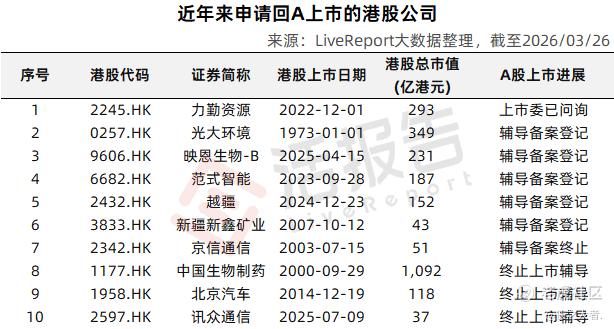 此前,百奥赛图成为近两年多来首家成功实现“H to A”的港股公司。而在其之后,包括力勤资源、光大环境、映恩生物-B、越疆、新疆新鑫矿业等在内的一些港股公司,也都在谋求回A上市的过程中。