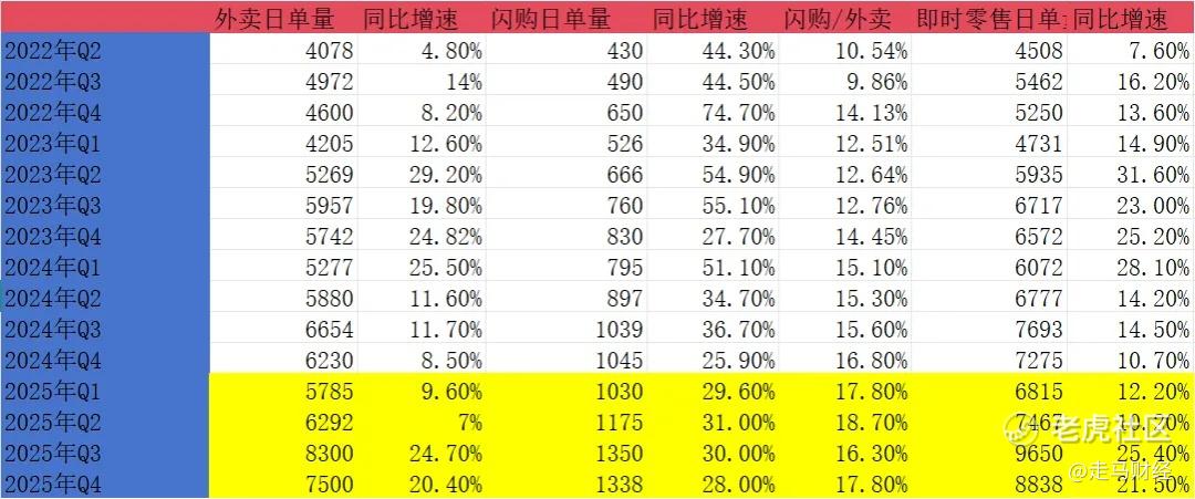 四季度外卖日均单量大约7500万,闪购日均单量大约1338万,即时零售日均单量大约8838万,单均亏损1.82元左右,到店酒旅GTV大约3150亿,货币化率大约6%,经营利润率大约25.5%。